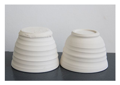 Trimming and Turning is the 2nd step in the pottery pottery wheel process and takes place once your pottery pieces are ‘leather hard’. In this step you make your vessels more pleasing to the eye, tidying up rough edges, shaping the rim, adding a foot at the base of the vessel and a few more tricks. After this session, we will bisque fire your work in our kiln. The image below shows a untrimmed pot (on the left) and a trimmed pot (on the right).